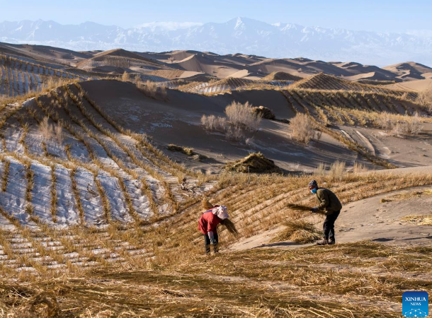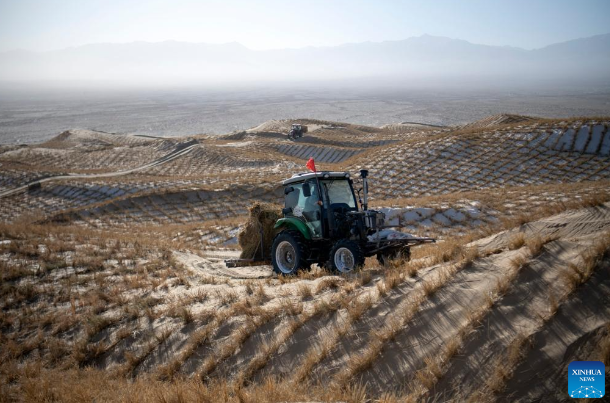 A staff member drives a tractor to transport materials for sand barriers in Kumtag Desert in Kazak Autonomous County of Aksay, northwest China's Gansu Province, Dec. 13, 2025. Covering a total area of 222,000 mu (14,800 hectares), a water conservation, ecological protection and restoration project is underway here, with sub-projects including sand fixation and afforestation. (Photo by Gao Hongshan/Xinhua)