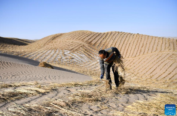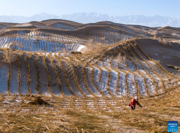 A staff member lays sand barriers in Kumtag Desert in Kazak Autonomous County of Aksay, northwest China's Gansu Province, Dec. 13, 2025. Covering a total area of 222,000 mu (14,800 hectares), a water conservation, ecological protection and restoration project is underway here, with sub-projects including sand fixation and afforestation. (Photo by Gao Hongshan/Xinhua)