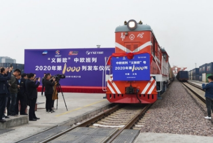 A freight train carrying 100 TEUs of goods departs from Yiwu, east China's Zhejiang Province, for Minsk in Belarus, Oct. 21, 2020, marking the 1,000th trip by China-Europe cargo trains in the province this year. (Photo by Gong Xianming/Xinhua)