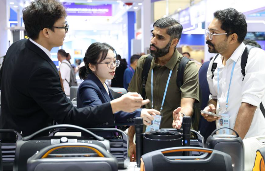 Foreign buyers learn about audio products during the 138th edition of the China Import and Export Fair in Guangzhou, south China's Guangdong Province, Oct. 15, 2025. (Xinhua/Lu Hanxin)