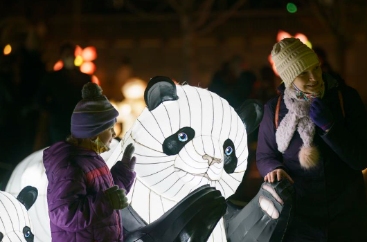 People visit a lantern display celebrating the upcoming Chinese Lunar New Year at the John F. Kennedy Center for the Performing Arts in Washington D.C., the United States, Jan. 29, 2022. (Photo by Ting Shen/Xinhua)