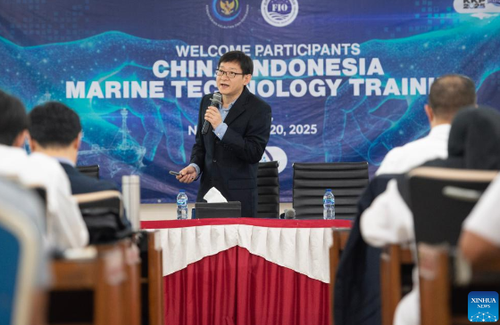 Wang Nengfei, a professor from China's Linyi University, speaks during the China-Indonesia Marine Technology Training program in Jakarta, Indonesia, on Nov. 18, 2025. The China-Indonesia Marine Technology Training program, jointly organized by the First Institute of Oceanography under China's Ministry of Natural Resources and Indonesia's Ministry of Marine Affairs and Fisheries, opened here on Monday. The four-day program aimed to strengthen bilateral cooperation in the blue economy through technical exchanges and knowledge sharing.(Xinhua/Veri Sanovri)
