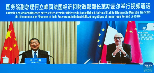 Chinese Vice Premier He Lifeng on Monday held a video meeting with French Finance Minister Roland Lescure. The two sides exchanged in-depth views on recent economic and financial cooperation between the two countries, as well as issues of common concern.
