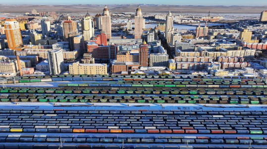 A drone photo taken on Dec. 10, 2025 shows China-Europe freight trains preparing to depart from the Manzhouli railway station in Manzhouli, north China's Inner Mongolia Autonomous Region. (Photo by Huang Xu/Xinhua)