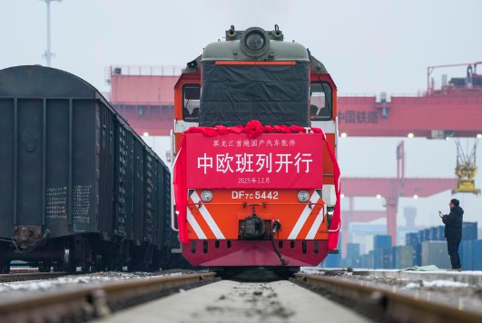 A China-Europe freight train loaded with containers of domestic auto parts is pictured at Harbin international container center station in Harbin, northeast China's Heilongjiang Province, Dec. 18, 2025. (Xinhua/Wang Song)
