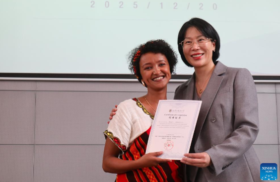 Hu Ruomei (R), course leader of the Global Female Entrepreneurship Empowerment Program workshop, takes a photo with a trainee at the graduation ceremony in Addis Ababa, the capital of Ethiopia, on Dec. 20, 2025. (Xinhua/Liu Fangqiang)