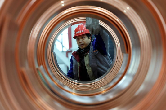 A worker prepares copper rod products for transportation at the workshop of a company in Huai'an, east China's Jiangsu Province, Jan. 19, 2026. (Photo by Yin Chao/Xinhua)