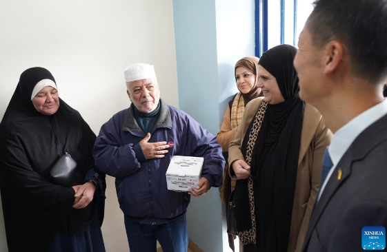 A Palestinian refugee with diabetes expresses gratitude for donated insulin syringes from China at the Baqa'a Refugee Camp in Jordan, on Jan. 28, 2026. China, in cooperation with the United Nations Relief and Works Agency for Palestine Refugees in the Near East (UNRWA), provided insulin syringes to Palestinian refugees at an event on Wednesday at the Baqa'a Refugee Camp in Jordan. Funded by the Global Development and South-South Cooperation Fund, the project will benefit more than 43,000 Palestinian refugees across the West Bank, Gaza, Jordan, Lebanon, and Syria who require insulin treatment. In Jordan alone, more than 11 million syringes will be distributed, enough to meet the needs of local refugees with diabetes for at least a year. (UNRWA/Handout via Xinhua)