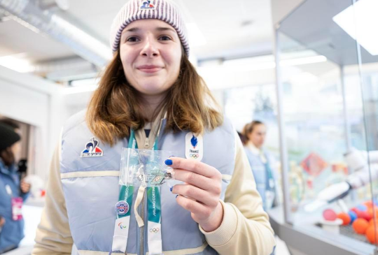 After lunch, French ice hockey player Anae Simon placed a pin from her national team into an orange capsule and waited for a robotic arm to drop it into a transparent ball pit in the Milano Olympic and Paralympic Village.