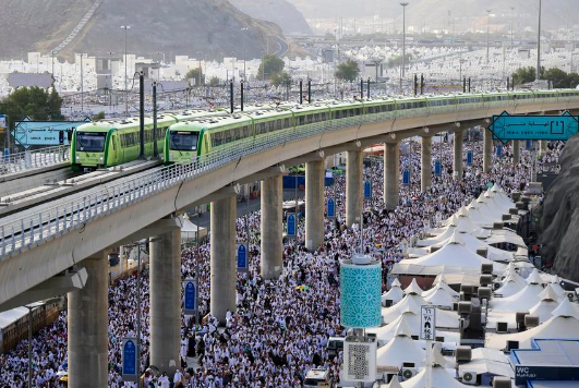 This photo, taken on June 16, 2024, shows trains running on the Al Mashaaer Al Mugaddassah Metro Line in Mecca, Saudi Arabia. (CRCC/Handout via Xinhua)