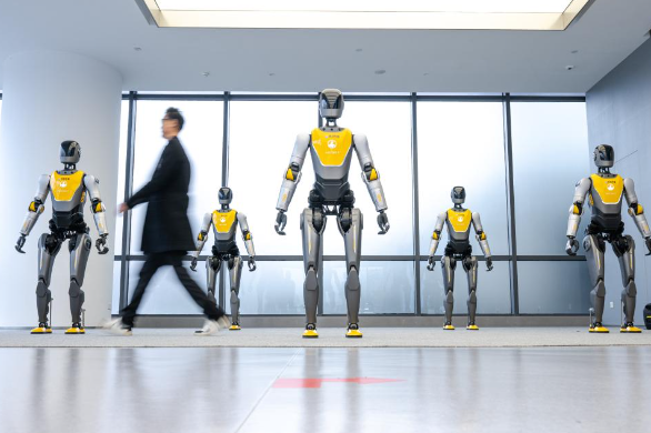 A visitor walks past robots displayed at a humanoid robot innovation center in Wuhan East Lake High-tech Development Zone, also known as the optics valley of China, in Wuhan, central China's Hubei Province, Dec. 4, 2025. (Xinhua/Xiao Yijiu)