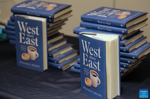 Copies of William Brown's book "West Meets East: Stories of Americans in China" are on display at a book launch event in New York, the United States, on March 21, 2026. William Brown, a professor at the School of Management at Xiamen University, launched his book "West Meets East: Stories of Americans in China" in New York on Saturday. (Xinhua/Liu Yanan)