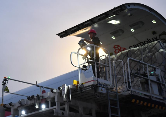 A staff member loads a cargo plane at Xinzheng International Airport in Zhengzhou, central China's Henan Province, Aug. 1, 2023. (Xinhua/Li Jianan)