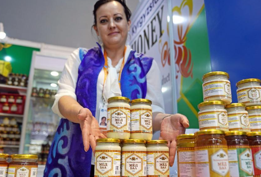 An exhibitor displays honey products from Kyrgyzstan at the 6th China International Import Expo (CIIE) in east China's Shanghai, Nov. 7, 2023. (Xinhua/Liu Ying)