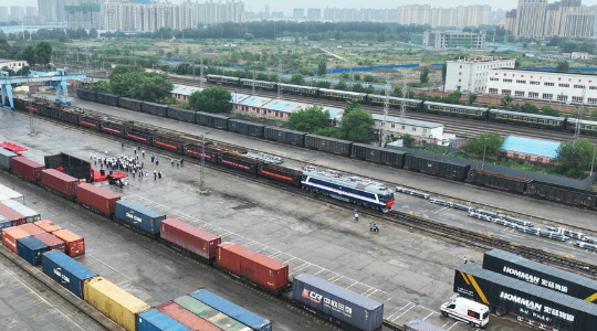 This aerial photo shows the first train of a new international multimodal transport route departing from Langfang City, north China's Hebei Province, July 4, 2023. (Photo by Jia Jun/Xinhua)