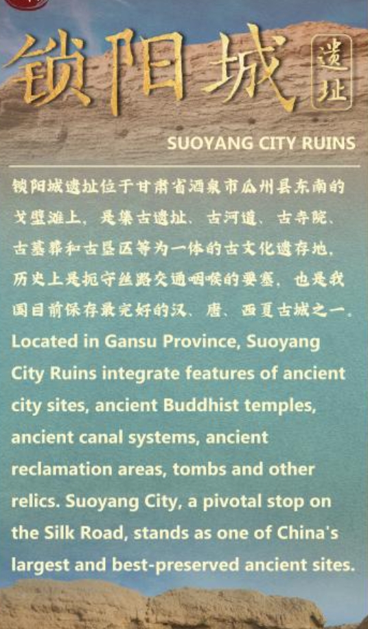 Located in Gansu Province, Suoyang City Ruins integrate features of ancient city sites, ancient Buddhist temples, ancient canal systems, ancient reclamation areas, tombs and other relics.