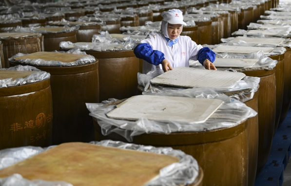 A staff member checks the condition of "zhacai", a traditional Chinese pickle made from mustard stems, at the workshop of Chongqing Fengdu Sanhe Industrial Co., Ltd. in southwest China's Chongqing Municipality, Oct. 23, 2023. (Xinhua/Wang Quanchao)