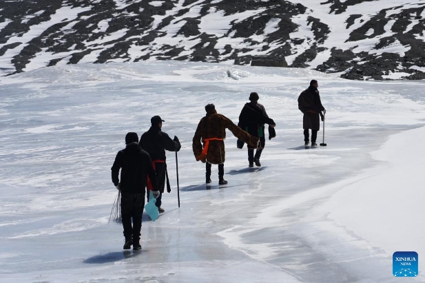 Glacier monitoring team members prepare to monitor a glacier in northwest China's Qinghai Province, March 8, 2023. (Xinhua/Chen Jie)