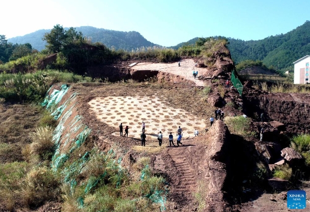 An aerial drone photo taken on Nov. 10, 2020 shows a dinosaur tracksite discovered in Lincheng Town, Longyan City, southeast China's Fujian Province. (Xinhua)