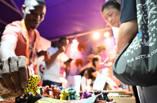 People view stone carving cultural and creative products at the exhibition booth of the Embassy of the Republic of Rwanda during the 2025 China International Fair for Trade in Services (CIFTIS) in Beijing, capital of China, Sept. 12, 2025. (Xinhua/Sui Shangjun)
