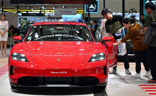 Visitors view a new energy vehicle of Porsche during the 2025 World New Energy Vehicle Congress (WNEVC 2025) in Haikou, south China's Hainan Province, Sept. 27, 2025. (Xinhua/Guo Cheng)