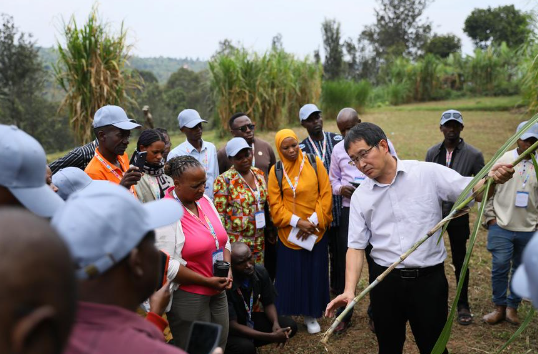 Chinese Juncao expert Lin Hui explains to trainees at the China-Rwanda Agriculture Technology Demonstration Center in Huye District, Rwanda, on July 17, 2025. (Photo by Huang Wanqing/Xinhua)