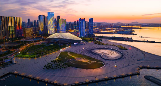 An aerial drone photo taken on June 3, 2023 shows the Dalian International Conference Center in Dalian, northeast China's Liaoning Province. (Photo by Piao Feng/Xinhua)