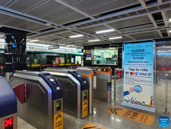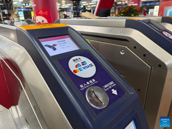This photo taken on Oct. 11, 2025 shows a banner promoting contactless payments with major international bank cards beside fare gates at a metro station in Guangzhou, south China's Guangdong Province.(Guangzhou Metro/Handout via Xinhua)