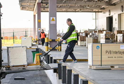 A worker of China Southern Air Logistics transports cargos at the international cargo terminal of Beijing Daxing International Airport in Beijing, capital of China, April 14, 2025. (Xinhua/Chen Zhonghao)