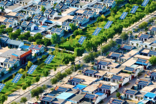 An aerial drone photo taken on Aug. 23, 2024 shows a solar photovoltaic system on the rooftops of buildings in Yuanlong Village of Minning Town, Yongning County in Yinchuan, capital of northwest China's Ningxia Hui Autonomous Region. (Photo by Yuan Hongyan/Xinhua)