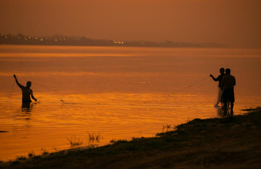 People fish in the Mekong River in Vientiane, Laos, March 5, 2025. (Photo by Kaikeo Saiyasane/Xinhua)