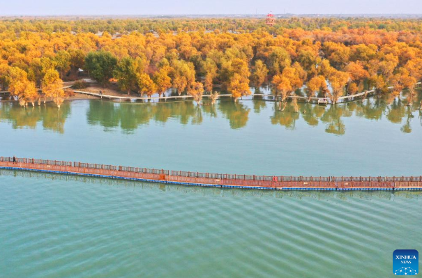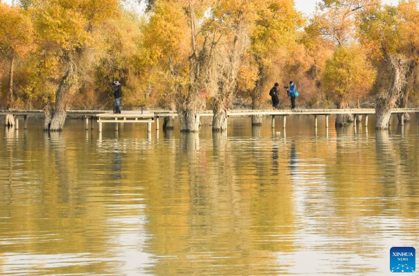 Tourists enjoy the autumn scenery of desert poplar (populus euphratica) forest in Xayar County, northwest China's Xinjiang Uygur Autonomous Region, Oct. 22, 2025. (Xinhua/He Xiaotong)