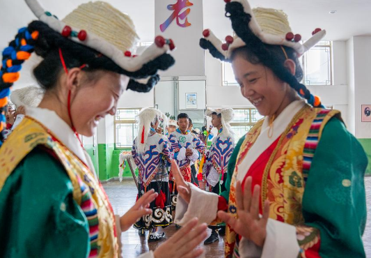 Students review moves of Tibetan opera at Lhasa No. 2 secondary vocational and technical school in Lhasa, southwest China's Xizang Autonomous Region, Sept. 9, 2025. (Xinhua/Tenzin Nyida)