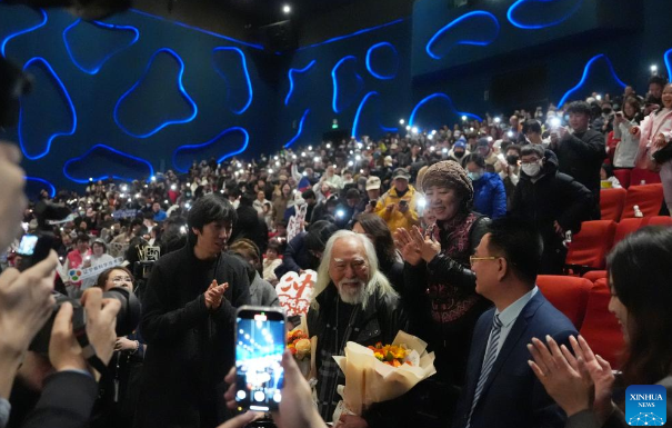 Actor Wang Deshun (C) interacts with the audience at a cinema in Shenyang, northeast China's Liaoning Province, March 19, 2025. (Xinhua/Li Gang)