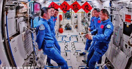 This image captured at Beijing Aerospace Control Center on Nov. 1, 2025 shows the crew of Shenzhou-20 and Shenzhou-21 spaceships talking with each other. (Xinhua/Jin Liwang)