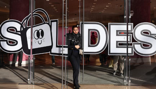 A customer walks out of the Galeries Lafayette Haussmann department store with winter sales signs on its gates in Paris, France, Jan. 10, 2025 (Xinhua/Gao Jing)