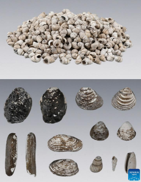 This combined photo shows the remains of aquatic mollusks discovered at the Baojia site in the city of Liyang, east China's Jiangsu Province.