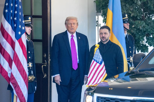 U.S. President Donald Trump (2nd L) welcomes Ukrainian President Volodymyr Zelensky at the White House in Washington, D.C., the United States, Oct 17, 2025. (Xinhua/Hu Yousong)