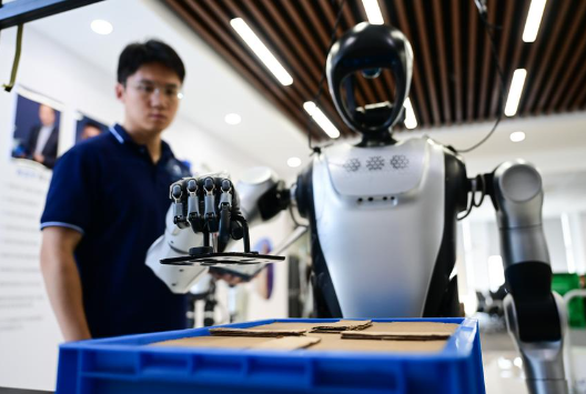 An engineer observes a humanoid robot grabbing a component at a laboratory of Leju Robotics in Hefei, east China's Anhui Province, Oct. 24, 2025. (Xinhua/Zhou Mu)