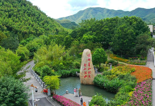 An aerial drone photo taken on Aug. 6, 2025 shows tourists visiting Yucun Village in Anji County of Huzhou City, east China's Zhejiang Province. (Xinhua/Mao Zhu)