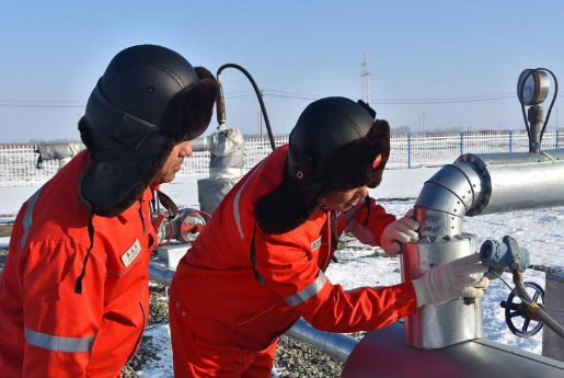 Workers check the pressure of a shale oil well of Jiqing Oilfield, in northwest China's Xinjiang Uygur Autonomous Region, Nov. 24, 2024. (Xinhua/Gu Yu)
