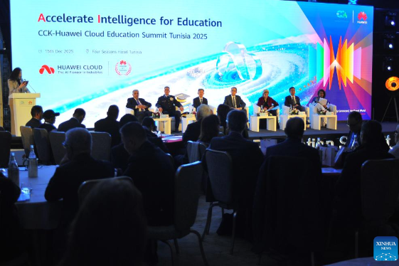 People attend a seminar in Tunis, Tunisia, Dec. 15, 2025. China's tech giant Huawei and Tunisia's Computing Center of Al-Khawarizmi (CCK) jointly held a seminar on Monday in Tunis, with the aim of enhancing Tunisia's smart education and telemedicine services. (Photo by Adel Ezzine/Xinhua)