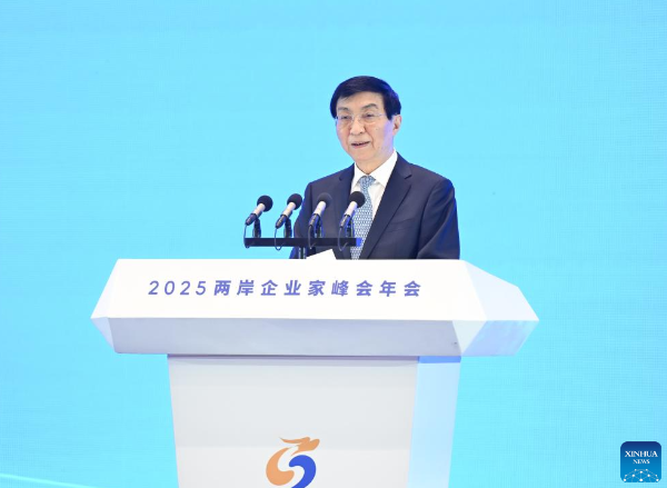 Wang Huning, a member of the Standing Committee of the Political Bureau of the Communist Party of China (CPC) Central Committee and chairman of the National Committee of the Chinese People's Political Consultative Conference, addressed the opening ceremony of the 2025 annual conference of the Cross-Strait CEO Summit.
