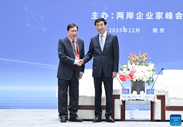 Wang Huning, a member of the Standing Committee of the Political Bureau of the Communist Party of China Central Committee and chairman of the National Committee of the Chinese People's Political Consultative Conference, meets with Liu Chao-shiuan, co-president of the Cross-Strait CEO Summit from Taiwan, and cross-strait entrepreneur representatives, before the opening ceremony of the 2025 annual conference of the Cross-Strait CEO Summit in Nanjing, east China's Jiangsu Province, Dec. 16, 2025. (Xinhua/Li Xiang)