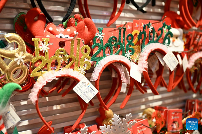 This photo taken on Dec. 17, 2025 shows "Hello 2026" hair decorations displayed at the Yiwu International Trade City in Yiwu, east China's Zhejiang Province. (Xinhua/Liu Che)