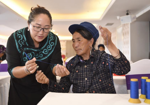 An inheritor (L) of the prefectural intangible cultural heritage of Yi-ethnic-group clothing guides a woman in Yi embroidery during a training class at a community in Butuo County of Liangshan Yi Autonomous Prefecture, southwest China's Sichuan Province, Aug. 13, 2020.(Xinhua/Liu Kun)