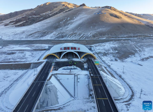 An aerial drone photo shows an exterior view of Tianshan Shengli Tunnel on Urumqi-Yuli Expressway in northwest China's Xinjiang Uygur Autonomous Region, Dec. 26, 2025. (Xinhua/Hu Huhu)