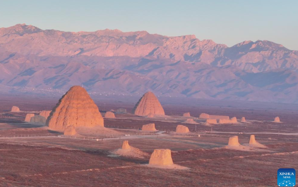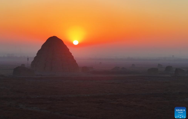 A drone photo taken on Dec. 28, 2025 shows a Xixia imperial tomb at sunrise in Yinchuan, northwest China's Ningxia Hui Autonomous Region. China's Xixia Imperial Tombs were officially added to the UNESCO World Heritage List on July 11, 2025 during the 47th session of the World Heritage Committee held in Paris, France. (Photo by Yuan Hongyan/Xinhua)