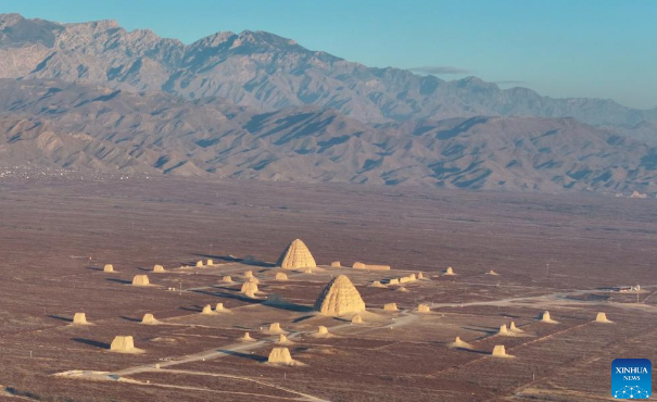 A drone photo taken on Dec. 28, 2025 shows Xixia imperial tombs in Yinchuan, northwest China's Ningxia Hui Autonomous Region. China's Xixia Imperial Tombs were officially added to the UNESCO World Heritage List on July 11, 2025 during the 47th session of the World Heritage Committee held in Paris, France. (Photo by Yuan Hongyan/Xinhua)
