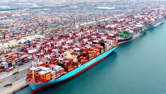 This aerial drone photo taken on Dec. 27, 2025 shows cargo ships loading and unloading containers at Qingdao Port in east China's Shandong Province. (Photo by Yu Fangping/Xinhua)